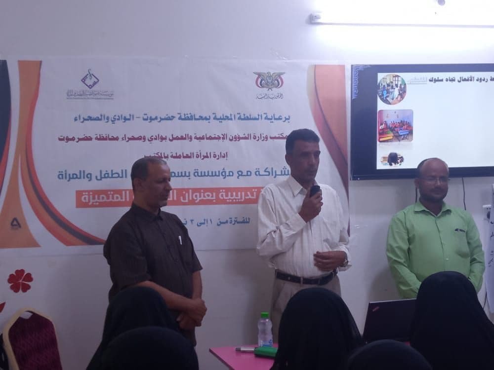 برعاية وكيل محافظة حضرموت لشؤن مديريات الو ادي الاستاذ عصام حبريش الكثيري والصحراء و مكتب وزارة الشؤن الاجتماعية والعمل بالوادي والصحراء وبالتنسيق مع مكتب وزارة التربية والتعليم بالوادي والصحراء بالشراكه مع مؤسسة بصمة نساء للسلام