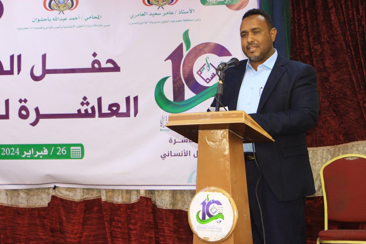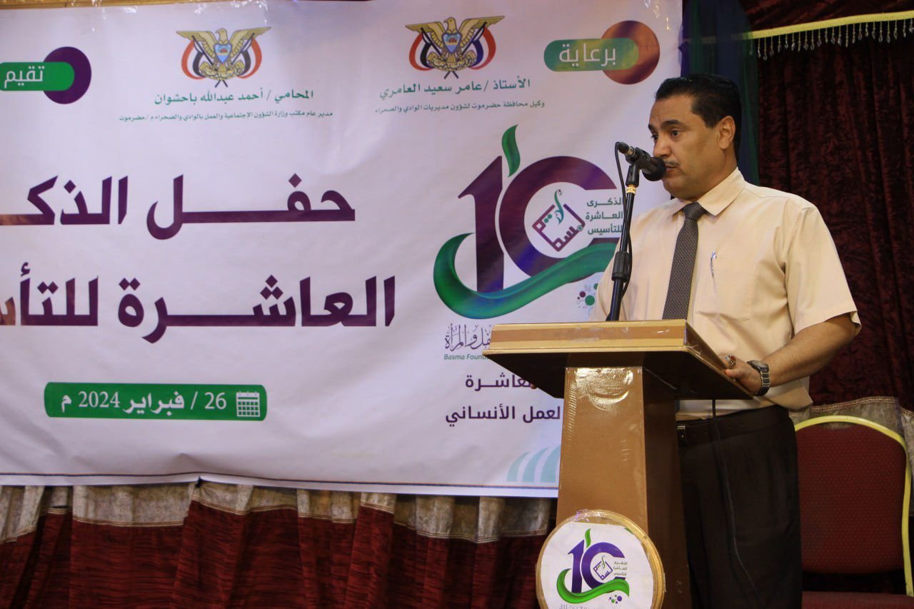 وألقى المحامي أحمد باحشوان مدير مكتب وزارة الشؤون الإجتماعية والعمل الوادي والصحراء كلمتة مهنئا مؤسسة بسمة في احتفالهم بمرور العقد الأول من تأسيس المؤسسة ، مؤكداً أن مكتب وزارة الشؤون الإجتماعية ثمنى هذه الجهودة للمؤسسة وتدخلاتها في الحماية معرباً أن المؤسسة تعتبر من المؤسسات الفاعلة بالمحافظة.