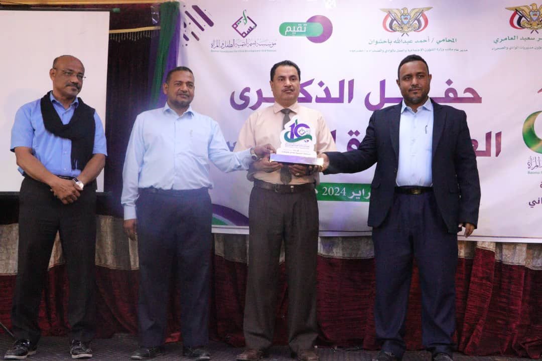 برعاية وكيل محافظة حضرموت لشؤون مديريات الوادي والصحراء، الأستاذ عامر العامري، ورعاية مدير عام مكتب وزارة الشؤون الاجتماعية والعمل بالوادي والصحراء، المحامي أحمد باحشوان، احتفلت مؤسسة بسمة لتنمية الطفل والمرأة، بمناسبة الذكرئ العاشرة لتأسيس المؤسسة، بحضور وكيل محافظة حضرموت المساعد لشؤون مديريات الوادي والصحراء، المهندس هشام محمد السعيدي، والأستاذ حسن جعفر مولى الدويلة ، مدير عام مديرية تريم.
