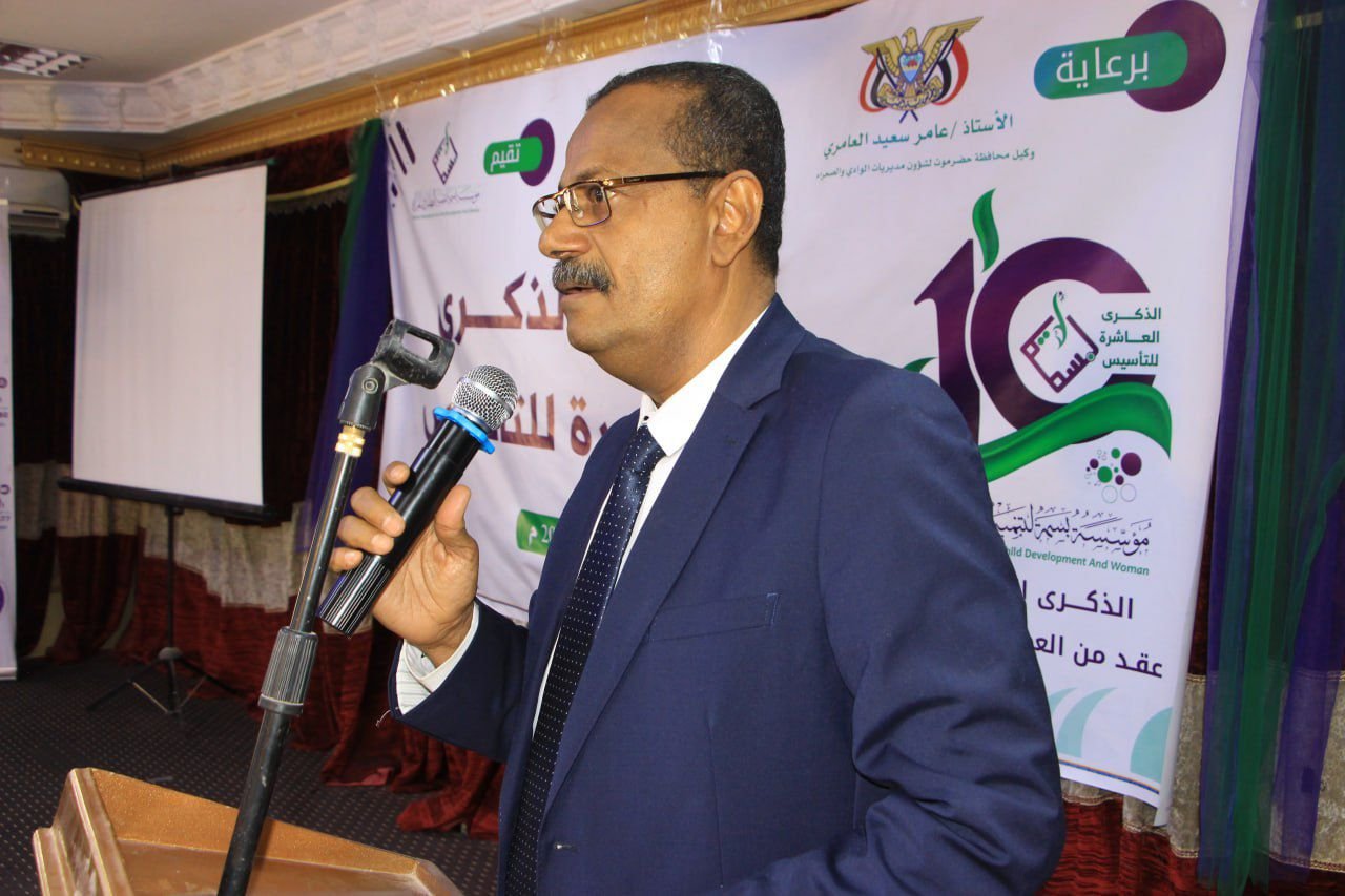 وتحدث الأستاذ محمد بن عبيدون رئيس مؤسسة بسمة لتنمية الطفل والمرأة في حفل الذكرى العاشرة لتأسيس المؤسسة مشيراً بجهود العاملين والمتطوعين في نجاح الوصول إلى هذه اللحظة التاريخية ومساندة السلطة المحلية متمثلة في وكيل المحافظة والوكلاء المساعدين ومدراء المديريات .