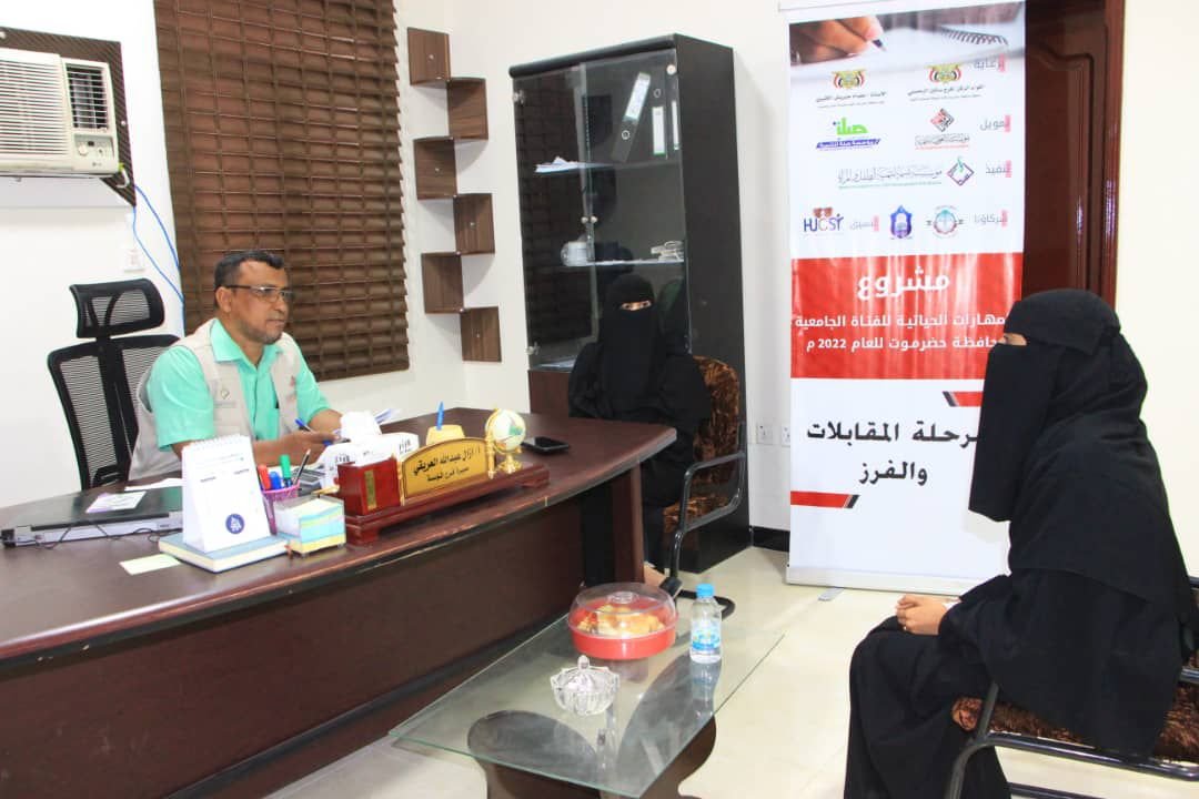 كما أوضح ضابط المشروع عن بدء إجراء المقابلات والفرز (المرحلة الاولى) لمجموعة من الطالبات المسجلات من جامعة حضرموت والوقوف على مدى استعدادهن لعملية التدريب بعد أن تم اختيارهن ضمن قائمة الطالبات المسجلات في المشروع البالغ عددهن 195 طالبة