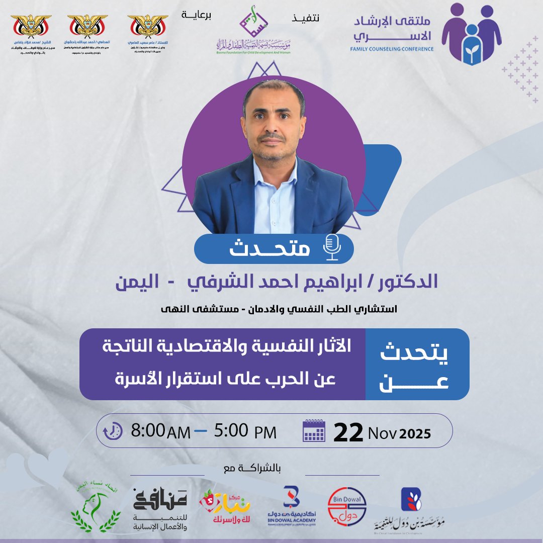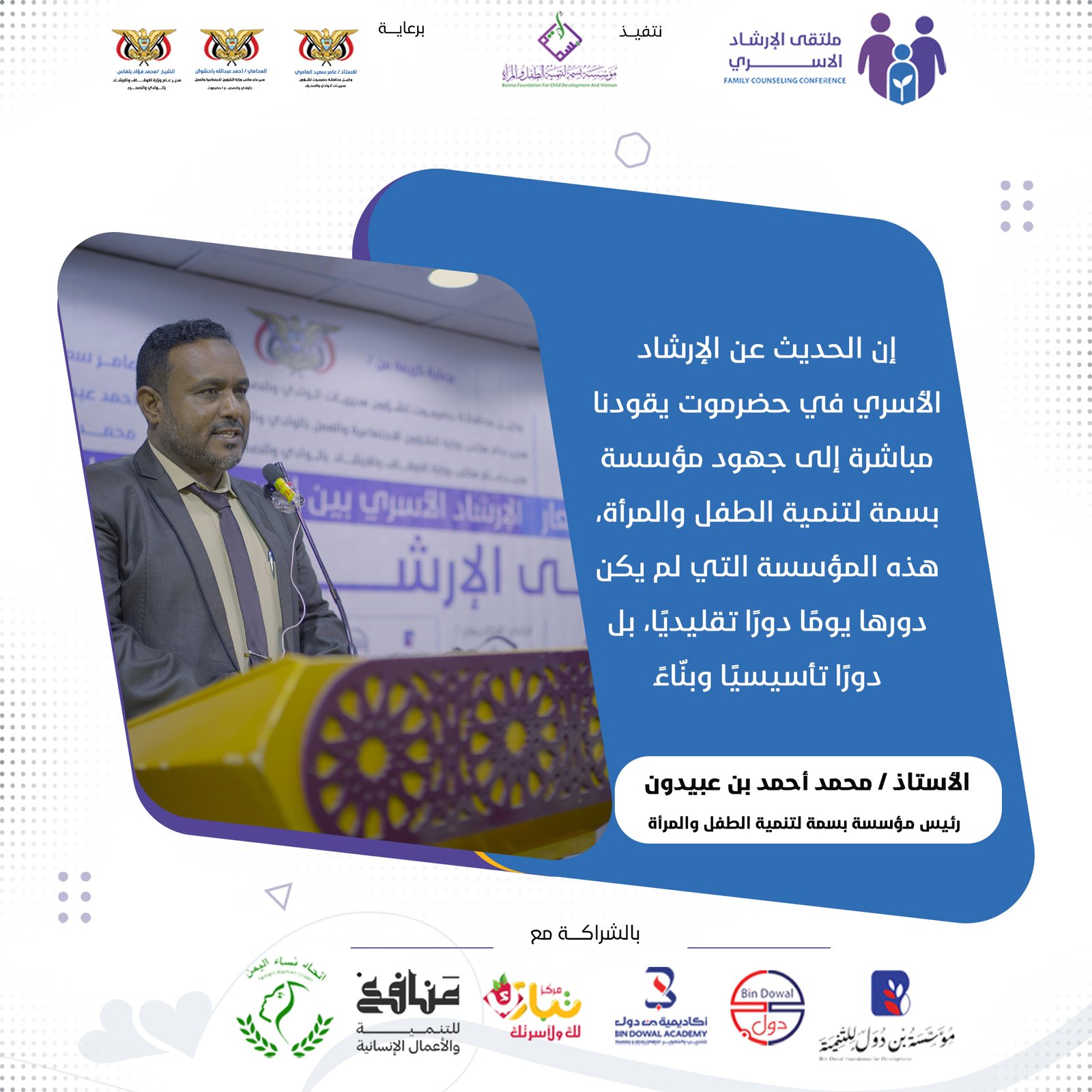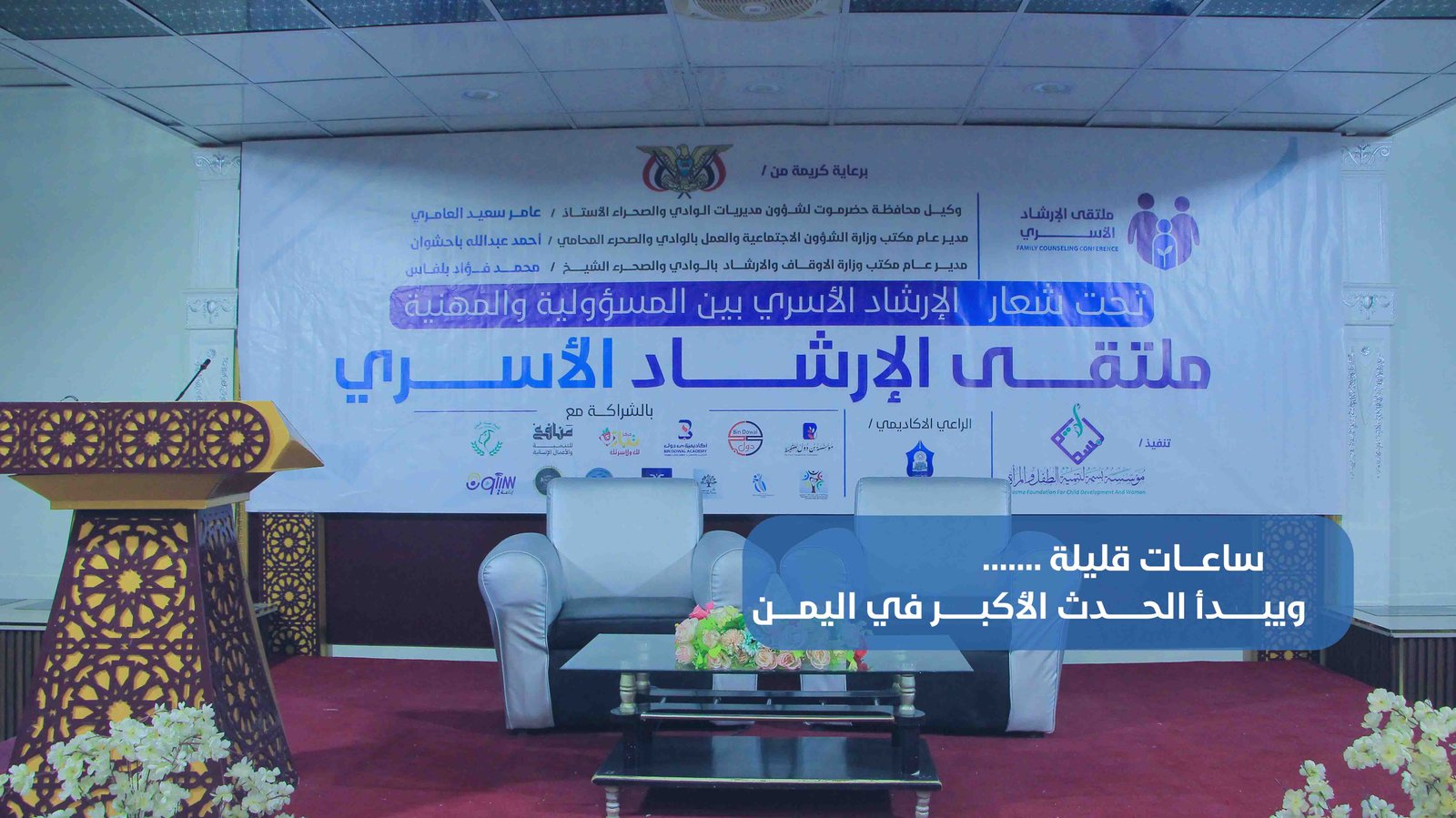 نظّمت مؤسسة بسمة لتنمية الطفل والمرأة، اليوم، بسيئون ملتقى الإرشاد الأسري بين المهنية والمسؤولية، وذلك بمشاركة مختصين وباحثين محليين ودوليين في مجالات الإرشاد النفسي والاجتماعي.
