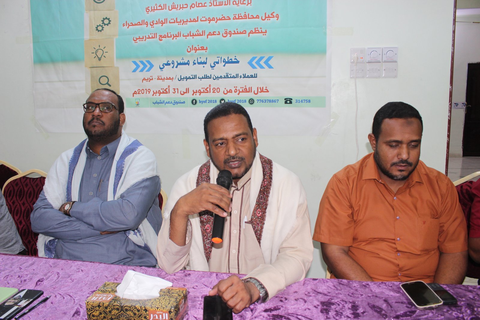 و أكد مدير عام مديرية تريم المستشار خالد عوض هويدي على أهمية ثقافة المشروع الخاص في تعزيز الاقتصاد المحلي ودخل الفرد وتوفير فرص عمل للشباب، شاكرا السلطة المحلية و قيادة الصندوق على الجهود التي يبذلونها لخدمة شباب حضرموت.